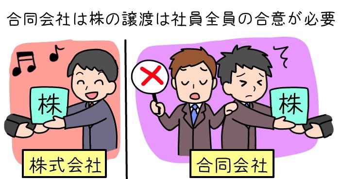 株式会社は株の譲渡や取得を原則自由に行うことができますが、合同会社の場合は社員全員の合意が必要となります。「業務の執行は株式会社では取締役が行い、合同会社では社員が行う」でご説明した通り合同会社の場合、出資者=経営者となります。つまり株を持っている人は必ず経営に参加しなければならないため社員の合意が必要となります。