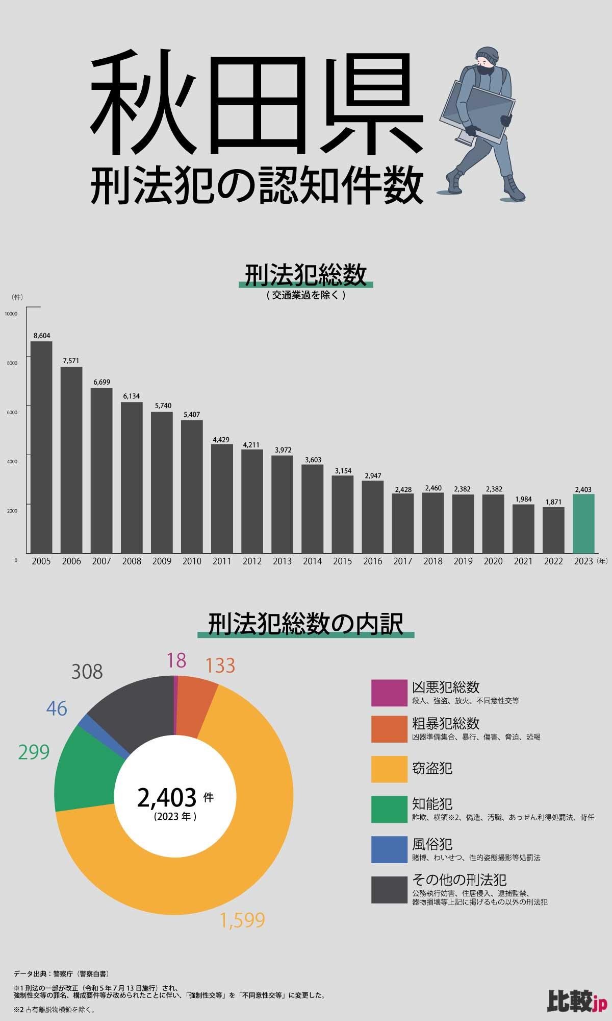秋田県では、2023年に2,403件の刑法犯が認知され、そのうち1,599件(約66%)が窃盗関係です。人口が比較的少ない地域でも、盗難リスクは身近なものになっています。防犯カメラは住まいや事業所を守るための「目」として有効です。(全国版)データ出典:警察白書