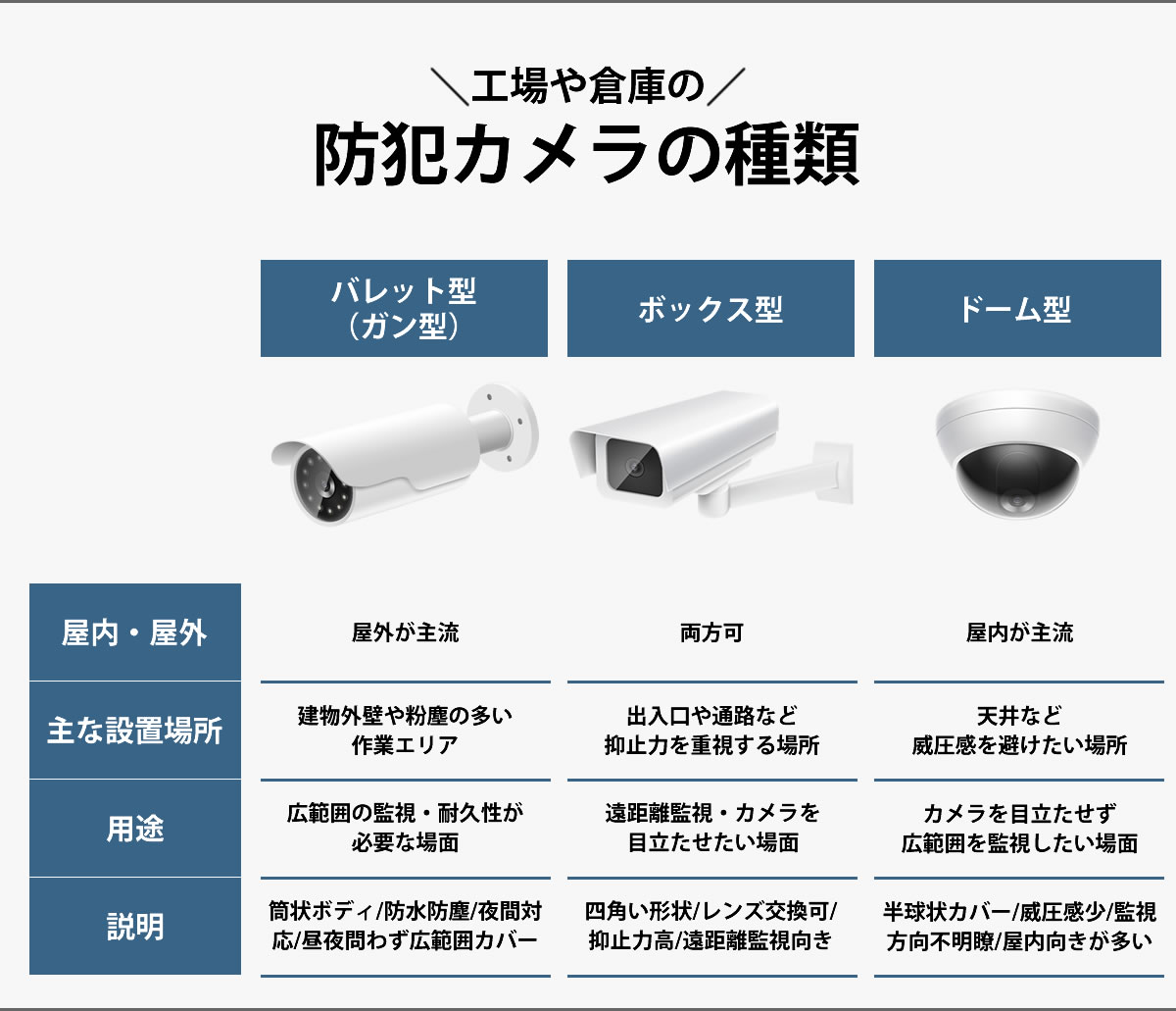 ボックス型、ドーム型、バレット型など、カメラの形状も工場や倉庫での使いやすさに関わります。