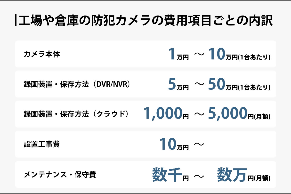 中規模の工場や倉庫では、出入口や保管エリア、作業エリアなどを一通りカバーするために10台前後を設置するケースが一般的です。カメラ本体、録画装置、配線工事を含めると、導入費用は50万〜100万円程度となることが多いです。