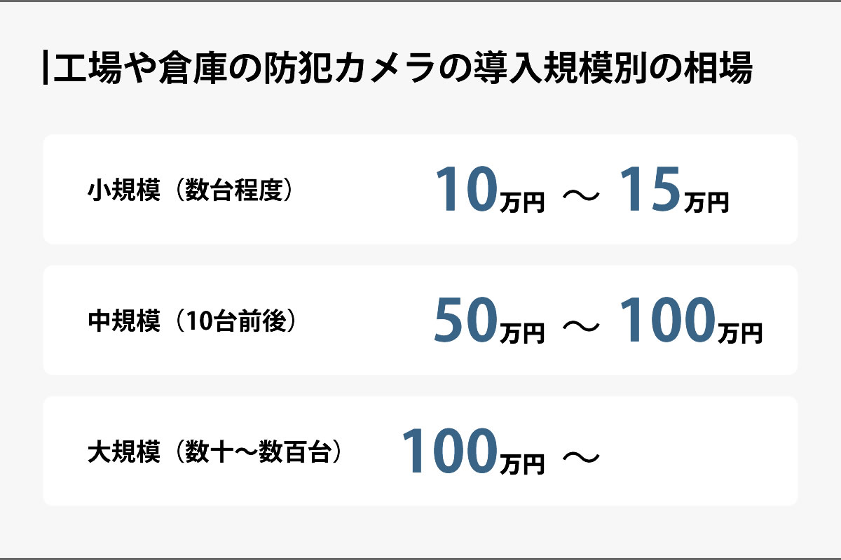 小規模な倉庫や店舗では、カメラを2〜3台設置するケースが多く、導入費用は10万〜15万円程度になることが一般的です。