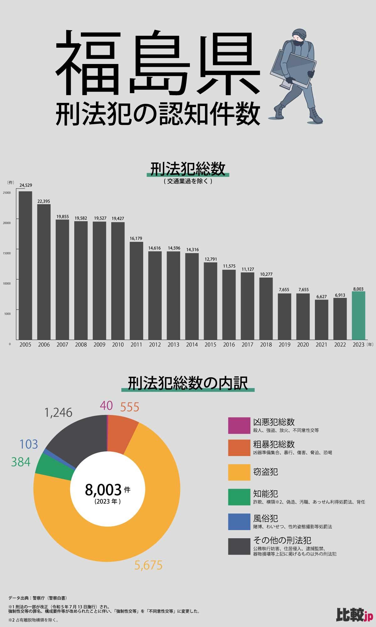 福島県では、2023年に8,003件の刑法犯が認知されており、そのうち5,675件(約71%)が窃盗事件です。郊外や住宅地での被害も多く、防犯意識の高まりが見られます。防犯カメラの設置は、日常の安全を確保するための有効な手段です。(全国版)データ出典:警察白書