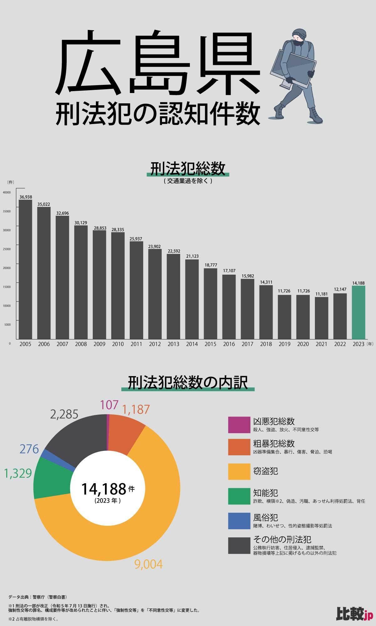 広島県では、2023年に14,290件の刑法犯が認知されており、そのうち10,173件(約71%)が窃盗犯です。市街地や郊外を問わず防犯対策の必要性が高まっています。防犯カメラは、地域の犯罪抑止と住民の安心を両立するための基本対策です。(全国版)データ出典:警察白書