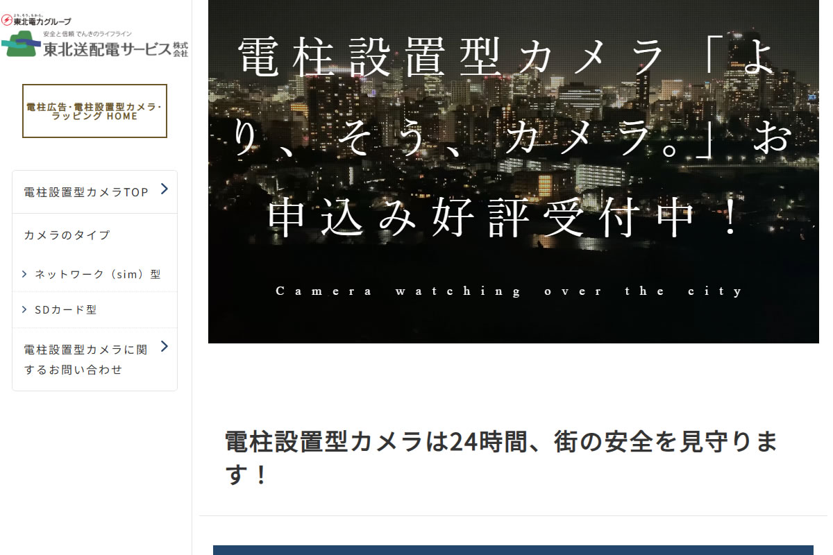 東北送配電サービス株式会社が提供する「より、そう、カメラ。」は、電柱に設置することで設置場所の確保や基礎工事が不要となり、コスト削減が可能です。