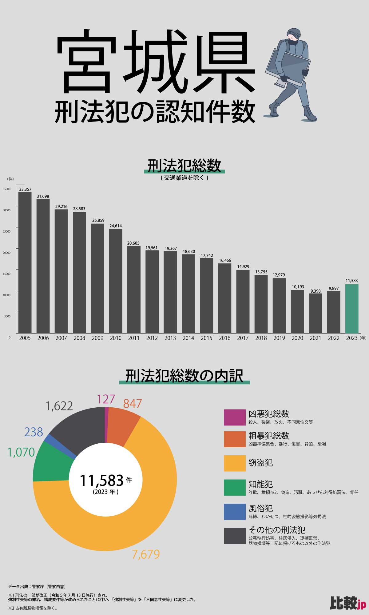 宮城県では、2023年に11,583件の刑法犯が発生し、窃盗が7,679件と全体の66%以上を占めています。住宅地や商業施設の防犯対策はもちろん、観光地での監視ニーズも高まっています。防犯カメラの導入は、幅広いエリアで有効な対策といえます。(全国版)データ出典:警察白書
