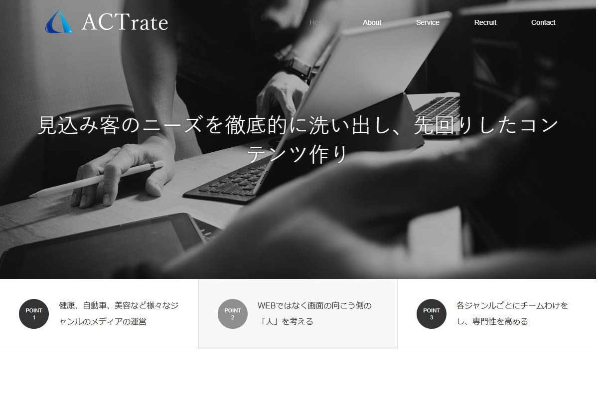 アクトレートは美容・自動車・健康など多岐にわたる分野で自社メディアを運営しています。各業界に特化したコンテンツを配信することで、検索エンジンからの集客を高め、広告掲載を通じたクライアントの売上支援を行っています。